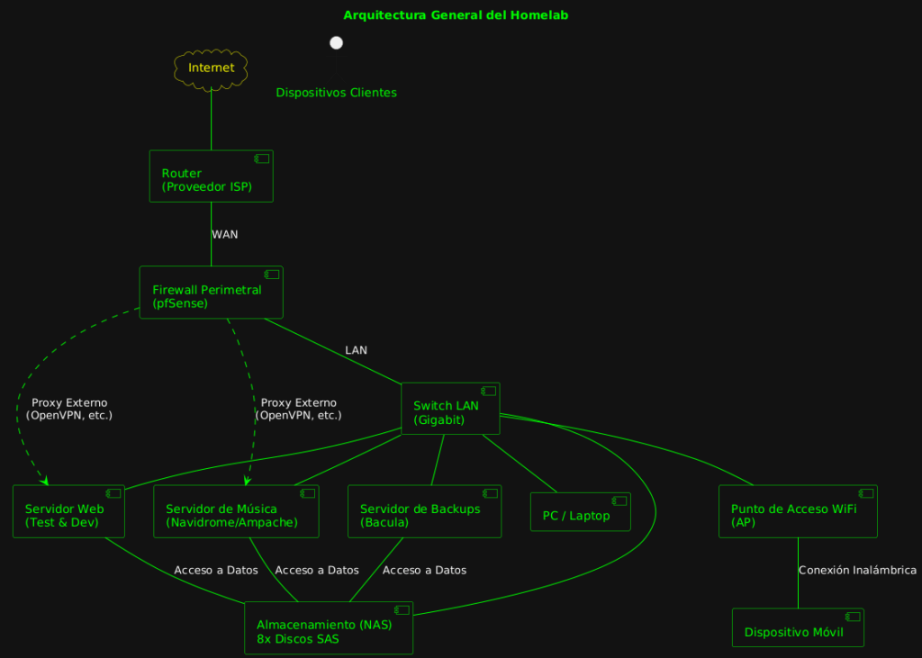 - pfSense: Sistema operativo de código abierto basado en FreeBSD, diseñado para funcionar como router y firewall. En mi caso, además, me ayudará a gestionar las Vlanes, actuar como proxy inverso para ofrecer las webs que me interesen (Navidrome / Ampache y su api) mientras además certifica las conexiones, levantar el servidor de VPN o limpiar por DNS el contenido que recibamos como haríamos con un piHole. Y, por supuesto, bastionar dentro de lo razonable lo que tengamos en la casa.